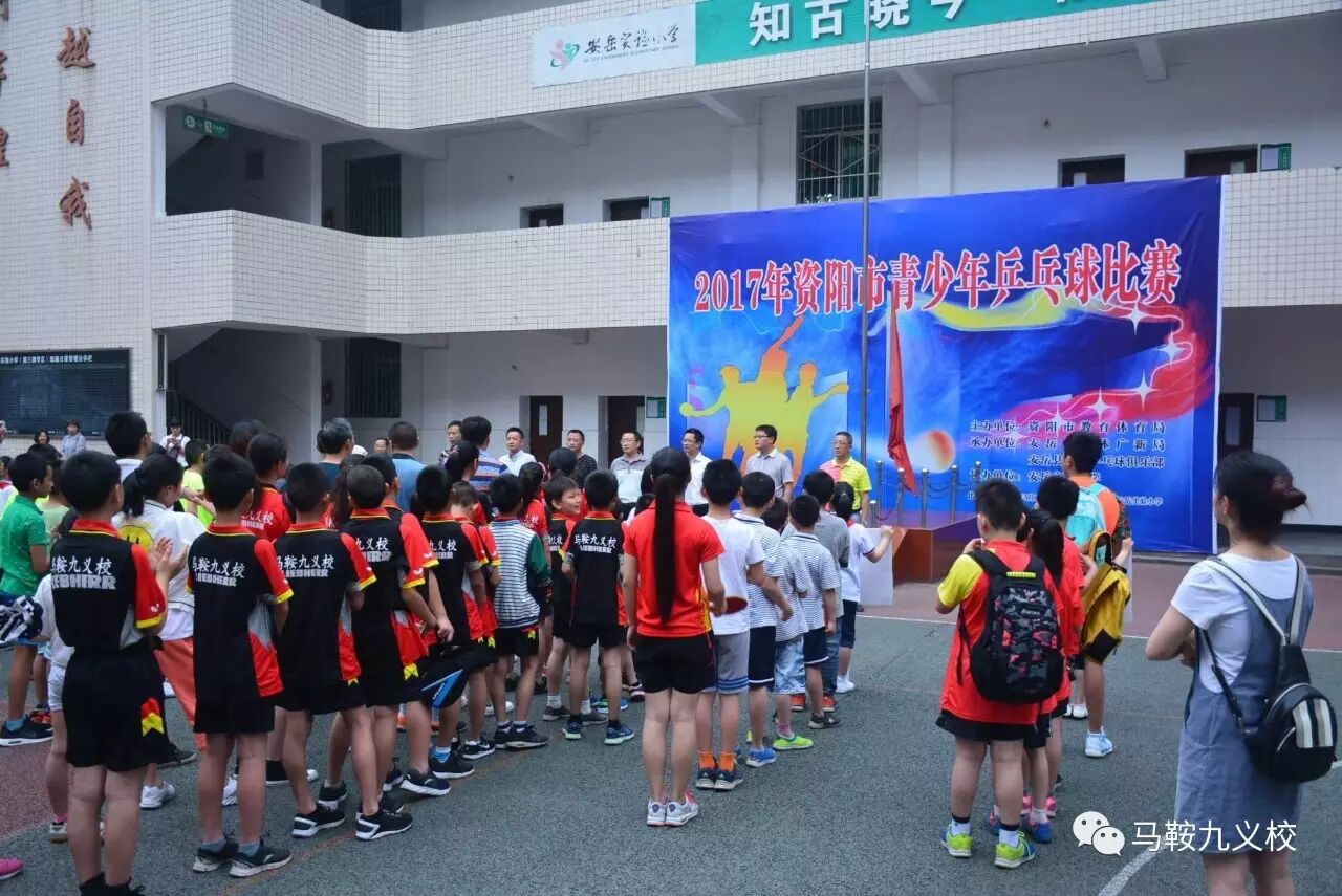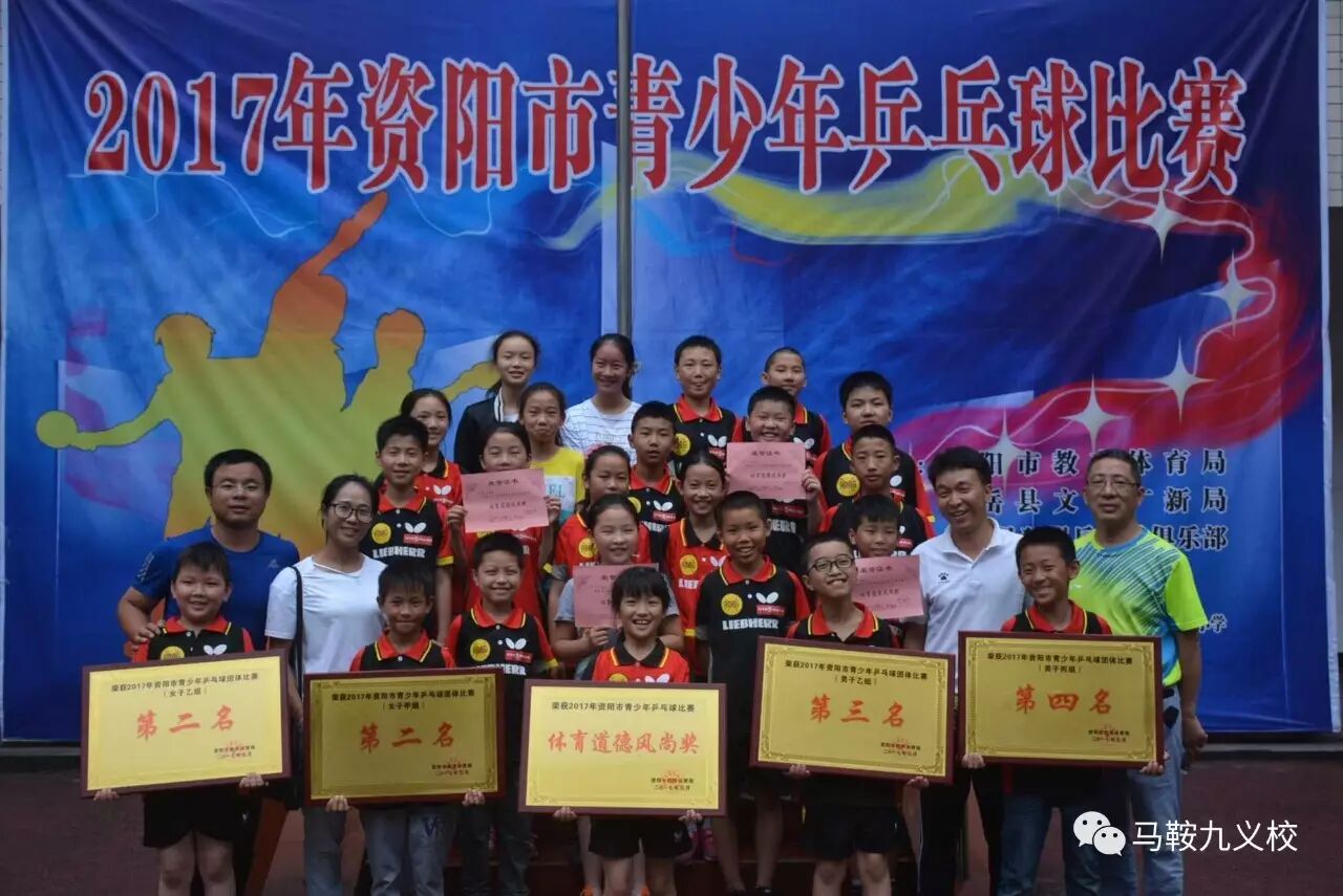 马鞍九义校代表队 参加2017年资阳市青少年乒乓球比赛喜获佳绩 由资阳市教育体育局主办的资阳市青少年乒乓球比赛于2017年5月19—21日在安岳实验小学举行,我校代表队参加了此次比赛,并取得佳绩。 赛前安排 开幕式 本次比赛设立竞赛项目为男女:团体、单打、双打、混双。在比赛中,我校参赛队员凭借扎实的功底、稳定的发挥,在众多强手中脱颖而出。经过三天的激烈奋战,我校代表队派出的5个团体都有斩获。分别是甲组女团第二名、甲组男团第四名、乙组女团第二名、乙组男团第三名、丙组男团第四名。在单打比赛中,队员陈雨佳获甲组女子第二名、康藐丹获丙组女子第一名等好成绩。双打比赛中,秦诗慧、王诗琴获甲组女子第二名的好成绩。混双比赛中,陈雨佳、黄康获甲组第一名,周志杰、王诗琴获甲组第三名,龙程斌、刘苡佟获乙组第二名,康藐丹、王超艺获丙组第一名,李尚原、王佳慧获丙组第二名。队员康藐丹、龙程斌、刘苡佟、张旭、李尚原获“体育道德风尚奖”荣誉称号。杨绍华、吕远、樊丽三位教师被评为“优秀教练员”。 比赛中 教练进行场外指导 此次比赛我校取得如此佳绩,离不开学校领导的高度重视、关心与支持,离不开主教练杨绍华老师从组织、备战到参赛的悉心指导,离不开队员每天的常规训练与赛前的强化训练,更在于参赛队员认真面对每一场比赛的正确态度。体育健儿们将秉承马鞍“优秀、勤奋”的精神,继续努力,力争来年取得更好成绩。